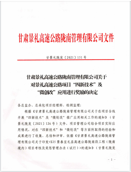 近日,甘肅分公司景禮項目部在甘肅景禮高速公路隴南管理有限公司組織的“四新技術”、“微創改”推廣應用、“品質工程”及施工標準化建設等檢查評比中名列前茅,項目管理公司對景禮項目部進行通報表揚,并給予獎勵40萬元。