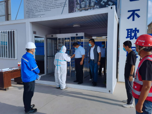 劉海泉一行首先深入施工現(xiàn)場,對進場務(wù)工人員來源地、供貨商貨源地等一些項目基本概況進行了解,并對現(xiàn)場體溫測量登記臺賬、外來人員進場登記臺賬、現(xiàn)場行程碼和健康碼設(shè)置情況、施工現(xiàn)場作業(yè)人員口罩佩戴情況,以及辦公區(qū)每日消殺記錄進行詳細檢查。隨后,劉海泉一行來到項目隔離區(qū),仔細檢查了現(xiàn)場隔離室設(shè)置情況,并叮囑項目部管理人員,隔離間的配備要符合要求,確保安全可靠。