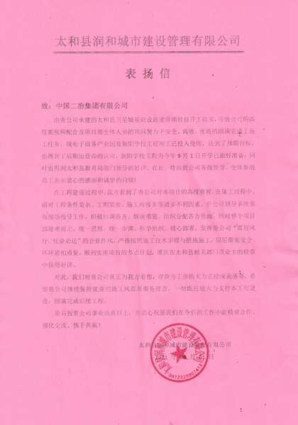 中國二冶收到太和城市建設(shè)管理公司表揚(yáng)信