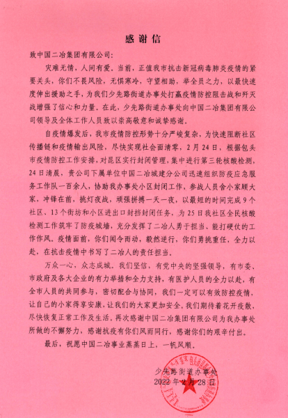 中國二冶收到少先路街道辦事處感謝信 ——表揚中國二冶抗疫中的央企擔當奉獻