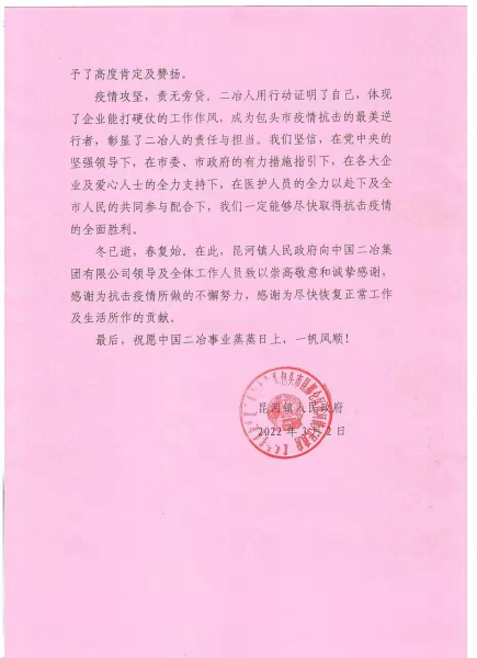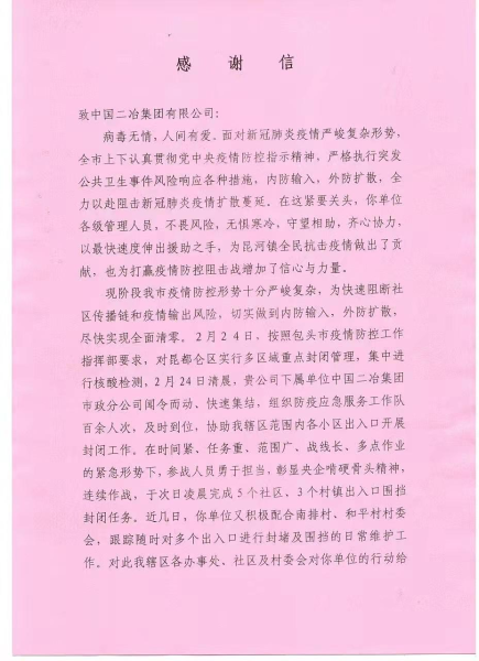 中國二冶收到昆河鎮政府感謝信 ——表揚中國二冶抗疫中的央企擔當