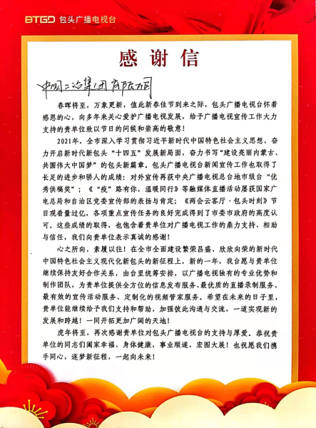 近日,中國二冶收到包頭廣播電視臺感謝信,信中對中國二冶多年來關心愛護包頭廣播電視發展,給予包頭廣播電視宣傳工作大力支持表示感謝,對中國二冶在2022年包頭廣播電視臺春節聯歡晚會中文化賦能、品牌推介和全程助力表示崇高的敬意。