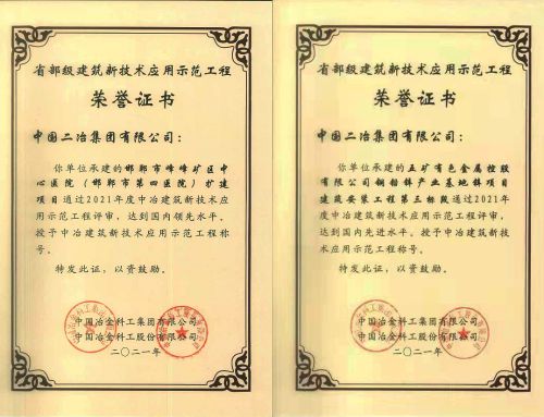 3月28日,中國二冶承建的五礦有色銅鉛鋅產業基地鋅項目建筑安裝工程第三標段項目和邯鄲市峰峰礦區中心醫院(邯鄲市第四醫院)擴建項目工程榮獲2021年度中國冶金科工集團有限公司、中國冶金科工股份有限公司建筑新技術應用示范工程。