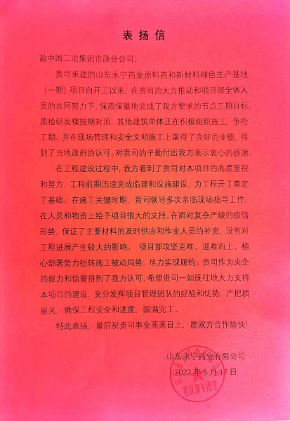 5月17日,中國二冶收到山東永寧藥業有限公司發來的感謝信,信中贊揚中國二冶在山東永寧藥業項目建設過程中,實干擔當、迎難而上、精心部署,努力克服工期緊、任務重等不利因素,在復雜嚴峻的疫情形勢下,保證材料供應和人員補充,嚴把質量關,打造精品工程,充分展現出央企的責任與擔當。