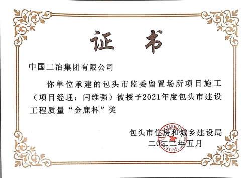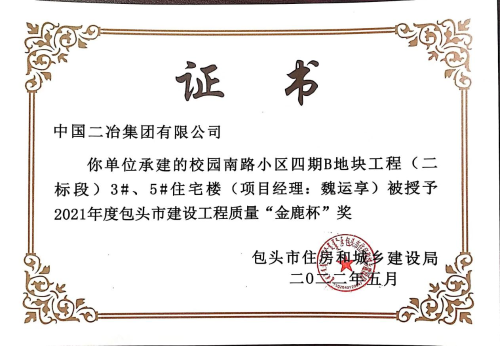 中國(guó)二冶三項(xiàng)工程喜獲2021年度包頭市“金鹿杯”工程質(zhì)量獎(jiǎng)