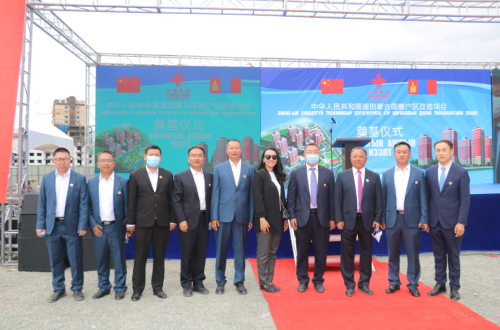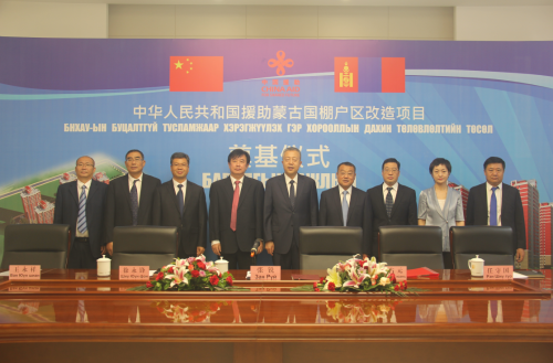 蒙方項目管理機構主要領導宣布中國援助蒙古國棚戶區改造項目正式啟動。蒙古國相關領導在禮儀人員的引導下來到奠基石前為工程開工培土奠基,開工儀式順利完成。