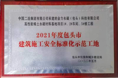 在2021年度包頭市建筑施工安全標準化示范工地評選活動中,中國二冶金力永磁(包頭)科技有限公司高性能稀土永磁材料基地項目1#、2#車間、5#樓工程,水泊東岸項目1#-10#住宅樓、社區綜合用房、地下車庫等項目榜上有名,為守護包頭市天更藍、水更清、地更綠盡顯央企擔當。