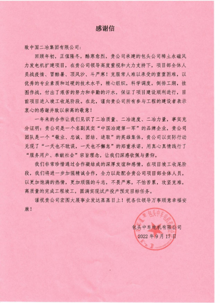 中國二冶收到包頭中車電機有限公司表揚信