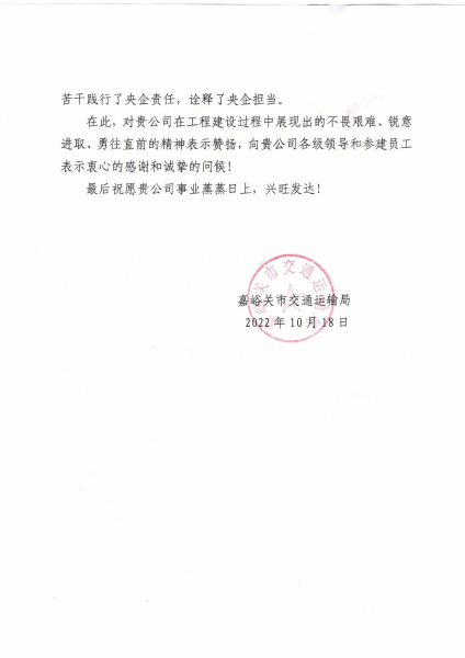 10月18日,中國二冶酒嘉項目收到甘肅省嘉峪關市交通運輸局表揚信,對酒嘉項目克服疫情困難,科學組織、精細管理,全力推進工程建設等工作提出贊揚和感謝。