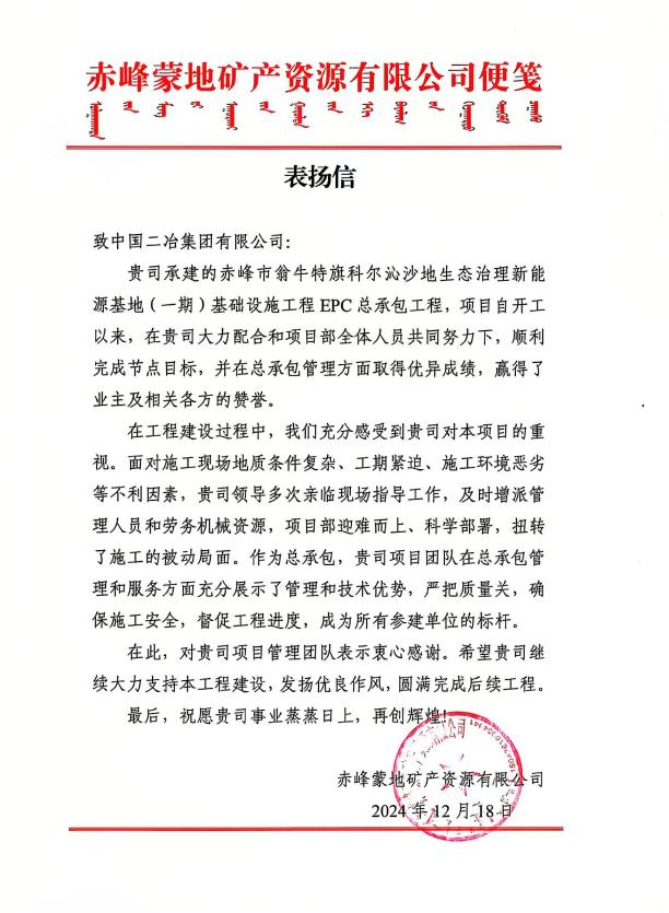 赤峰蒙地礦產(chǎn)資源有限公司在信中表示,赤峰翁牛特科爾沁沙地治理項(xiàng)目自開工建設(shè)以來(lái),面對(duì)諸多不利因素,項(xiàng)目建設(shè)團(tuán)隊(duì)主動(dòng)作為,精心策劃、合理安排,在施工管理過(guò)程中對(duì)施工質(zhì)量嚴(yán)格把關(guān),最終安全優(yōu)質(zhì)完成項(xiàng)目節(jié)點(diǎn)目標(biāo),樹立了央企典范。