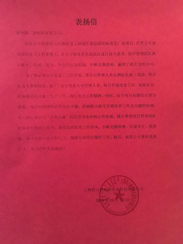 土默特右旗創(chuàng)科農(nóng)業(yè)科技有限公司在信中表示,土右旗食品園區(qū)標(biāo)準(zhǔn)化廠房項(xiàng)目團(tuán)隊(duì)面對(duì)各種挑戰(zhàn)和復(fù)雜情況,始終能夠從全局出發(fā),冷靜應(yīng)對(duì)、及時(shí)調(diào)整,穩(wěn)步推進(jìn)施工進(jìn)度,高效開展工程建設(shè)任務(wù),順利完成節(jié)點(diǎn)目標(biāo),以實(shí)際行動(dòng)彰顯了專業(yè)能力和責(zé)任擔(dān)當(dāng)。