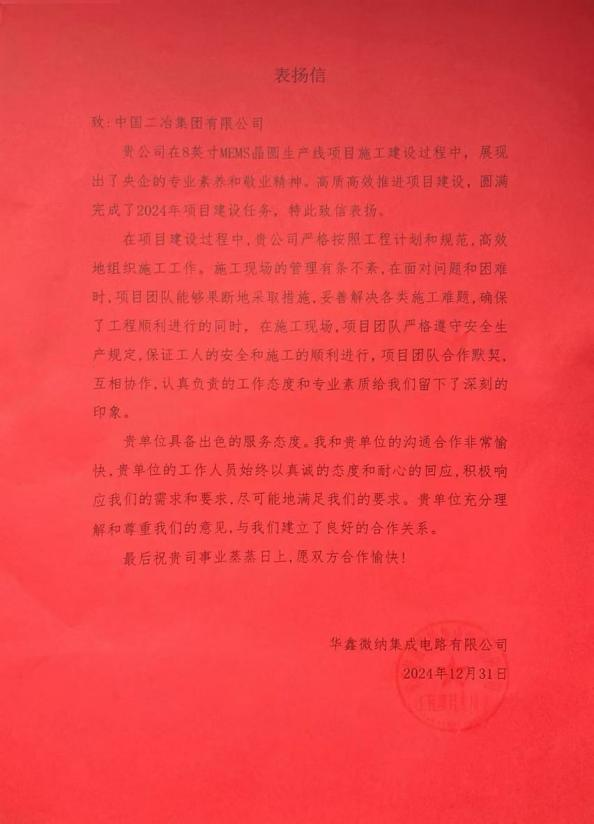 華鑫微納集成電路有限公司在信中表示,8英寸MEMS晶圓生產(chǎn)線項(xiàng)目建設(shè)團(tuán)隊(duì)精心編制策劃與方案、嚴(yán)格按照工程計(jì)劃和規(guī)范,高效組織各項(xiàng)施工工作,?始終保持著高度的責(zé)任感和使命感,?以精湛的技術(shù)、?嚴(yán)謹(jǐn)?shù)膽B(tài)度和飽滿的干勁確保了工程的順利推進(jìn)。