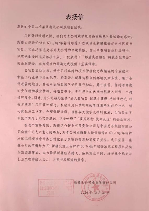 新疆昆侖鋅業(yè)有限責(zé)任公司在信中表示,自項(xiàng)目啟動(dòng)以來(lái),新疆火燒云鉛鋅礦60萬(wàn)噸/年鉛鋅冶煉工程項(xiàng)目以卓越的項(xiàng)目管理能力和精湛的專業(yè)技術(shù),彰顯了行業(yè)領(lǐng)導(dǎo)者的風(fēng)范。特別是在面對(duì)自然環(huán)境復(fù)雜多變、施工條件艱苦的挑戰(zhàn),項(xiàng)目團(tuán)隊(duì)始終堅(jiān)守初心,勇往直前,保持高度的責(zé)任感和敬業(yè)精神,為項(xiàng)目的早日投產(chǎn)奠定堅(jiān)實(shí)的基礎(chǔ)。