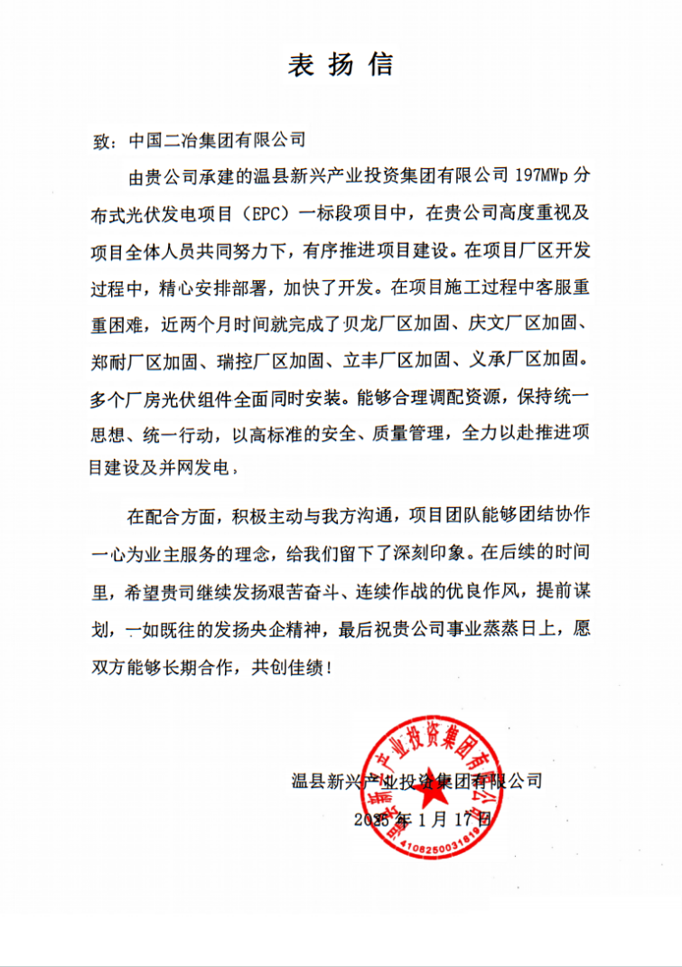溫縣新興產(chǎn)業(yè)投資集團(tuán)有限公司在信中寫道,自項(xiàng)目開工以來,在公司領(lǐng)導(dǎo)和項(xiàng)目全體建設(shè)者的共同努力下,精心安排部署,層層壓實(shí)責(zé)任,克服重重困難,近兩個(gè)月時(shí)間,完成了多個(gè)廠房光伏組件安裝任務(wù)。在建設(shè)過程中能夠發(fā)揮央企精神、踐行責(zé)任擔(dān)當(dāng),積極主動(dòng)溝通,合理調(diào)配資源,全方位推動(dòng)項(xiàng)目的優(yōu)質(zhì)履約,希望雙方能夠長(zhǎng)期合作,共創(chuàng)佳績(jī)。