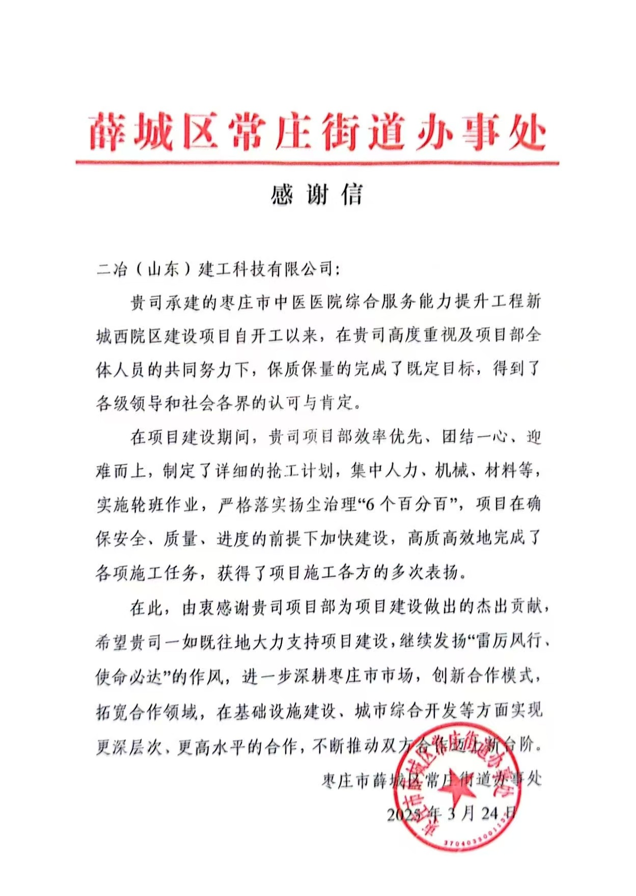 3月24日,中國二冶全資子公司二冶(山東)建工收到棗莊市薛城區常莊街道辦事處的感謝信。信中對棗莊中醫醫院項目開工以來的卓越表現給予了極高的贊譽。